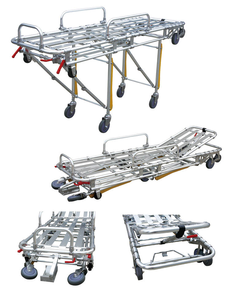 采用高質(zhì)鋁合金材料,配接件鋁合金壓鑄。采用海綿軟墊,使傷病員躺臥舒適。折腿機(jī)械結(jié)構(gòu),通過左右手柄控制。僅需一名救護(hù)人員把病人推上救護(hù)車。固定支架與救護(hù)車相固定,擔(dān)架通過滑道上車后可鎖定。