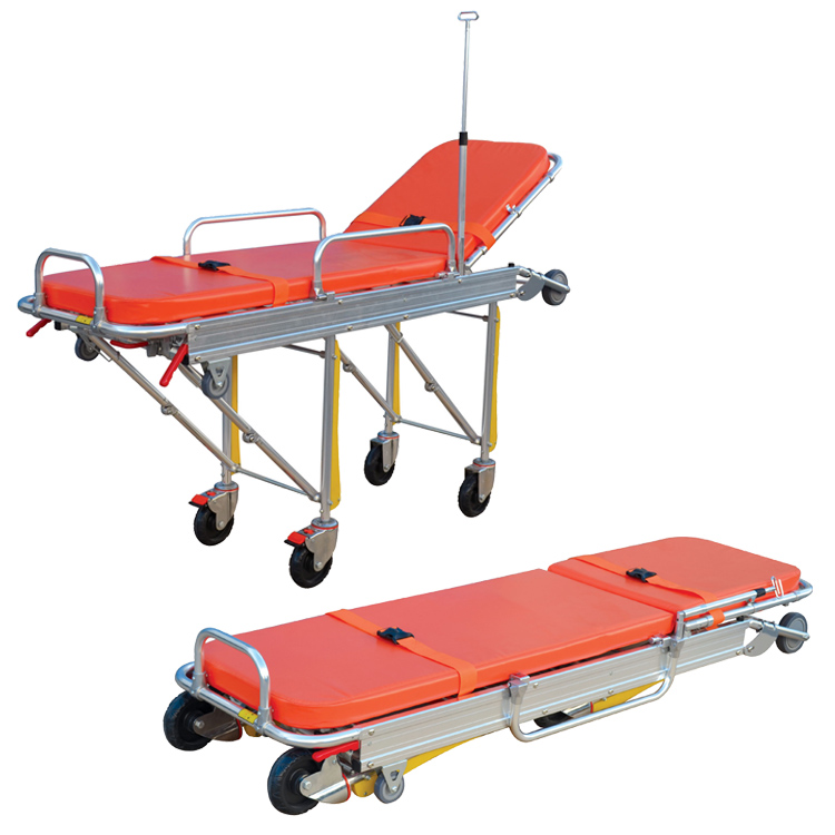 采用高質(zhì)鋁合金材料,配接件鋁合金壓鑄。采用海綿軟墊,使傷病員躺臥舒適。折腿機械結(jié)構(gòu),通過左右手柄控制。僅需一名救護人員把病人推上救護車。固定支架與救護車相固定,擔(dān)架通過滑道上車后可鎖定。