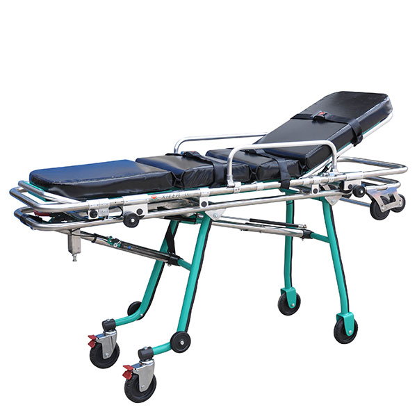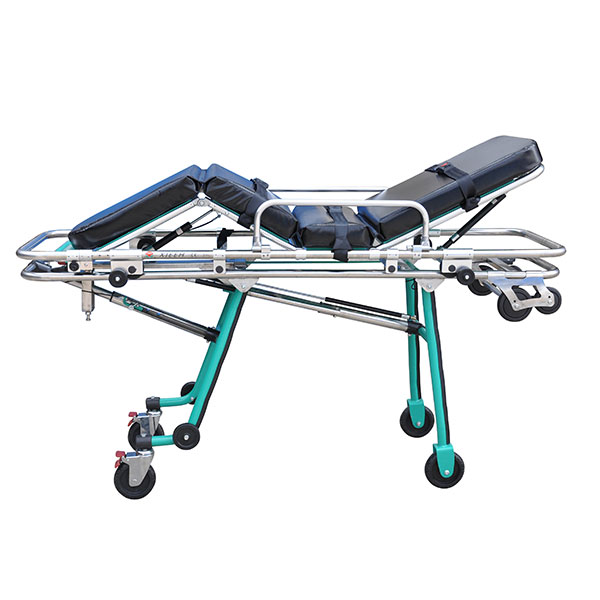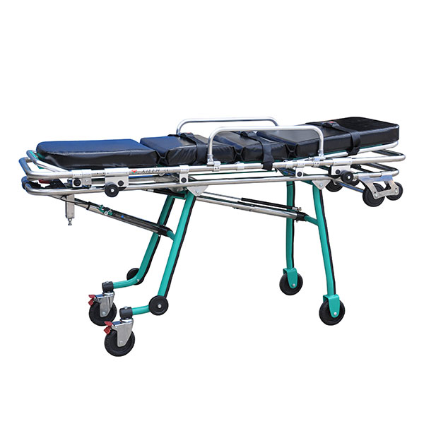 擔(dān)架面可分離,有鎖定裝置??勘辰嵌扔蓺鈴椈烧{(diào)節(jié),范圍0-65°。可翻轉(zhuǎn)護(hù)欄在轉(zhuǎn)移過程中保護(hù)病人。折腿機(jī)構(gòu)由右把手控制,僅需一人就可把擔(dān)架推上救護(hù)車,當(dāng)擔(dān)架在救護(hù)車上時(shí),可用固定裝置鎖住,本擔(dān)架由高強(qiáng)度鋁合金材料構(gòu)成,φ150mm,125mm寬面橡膠輪,主要用于救護(hù)車,醫(yī)院,急救中心。